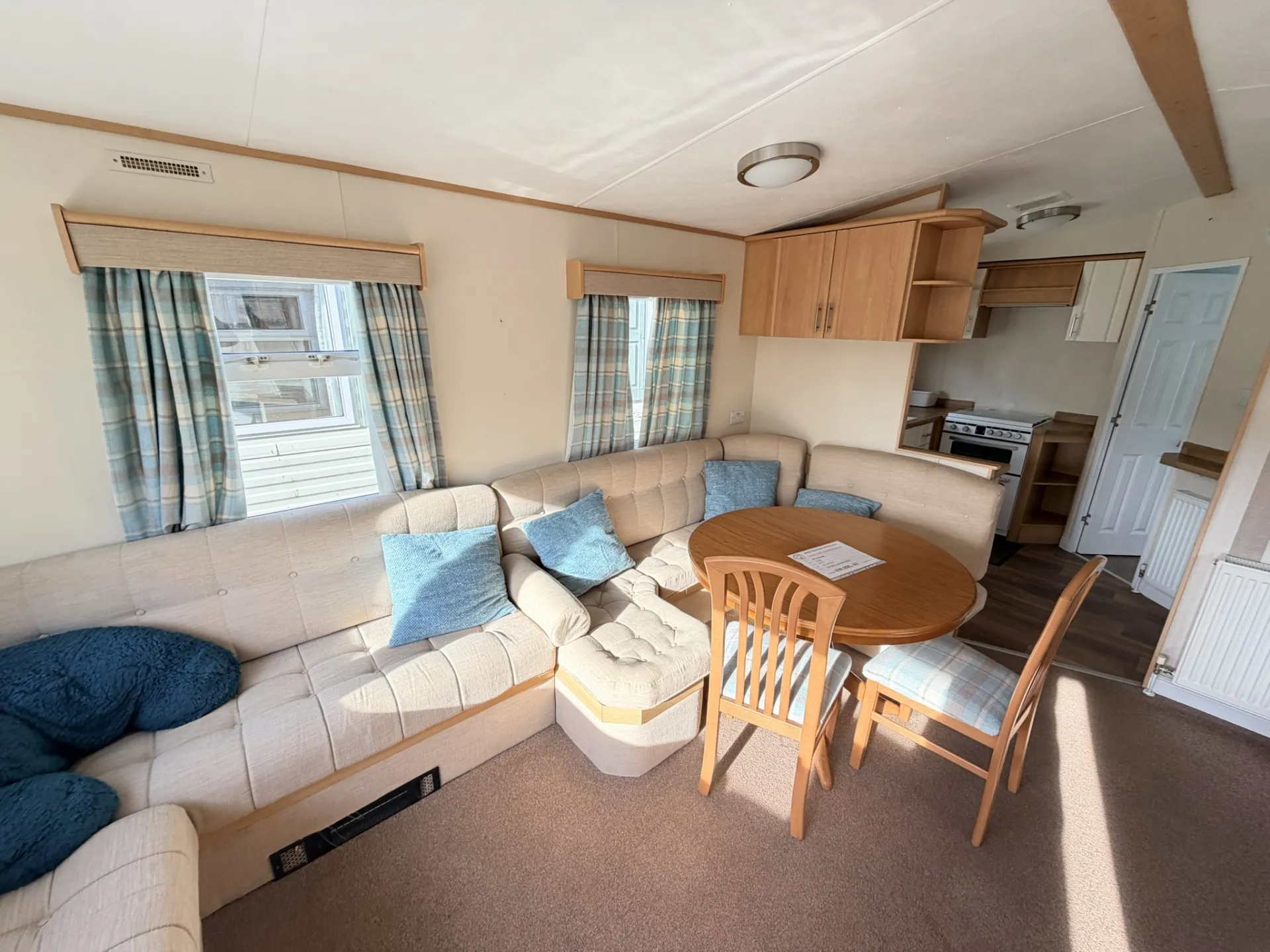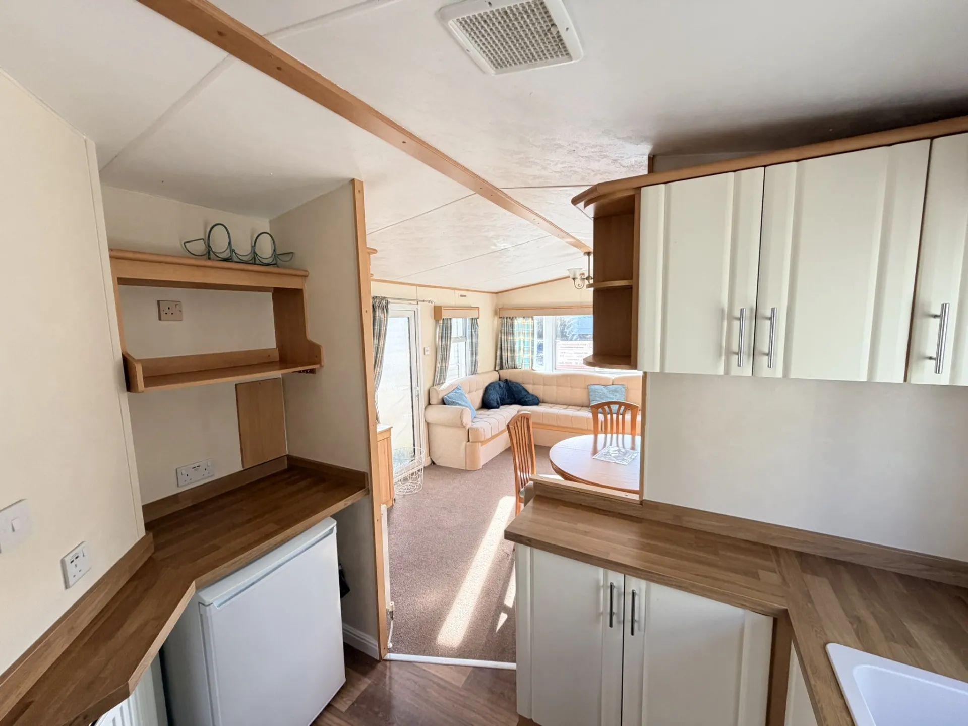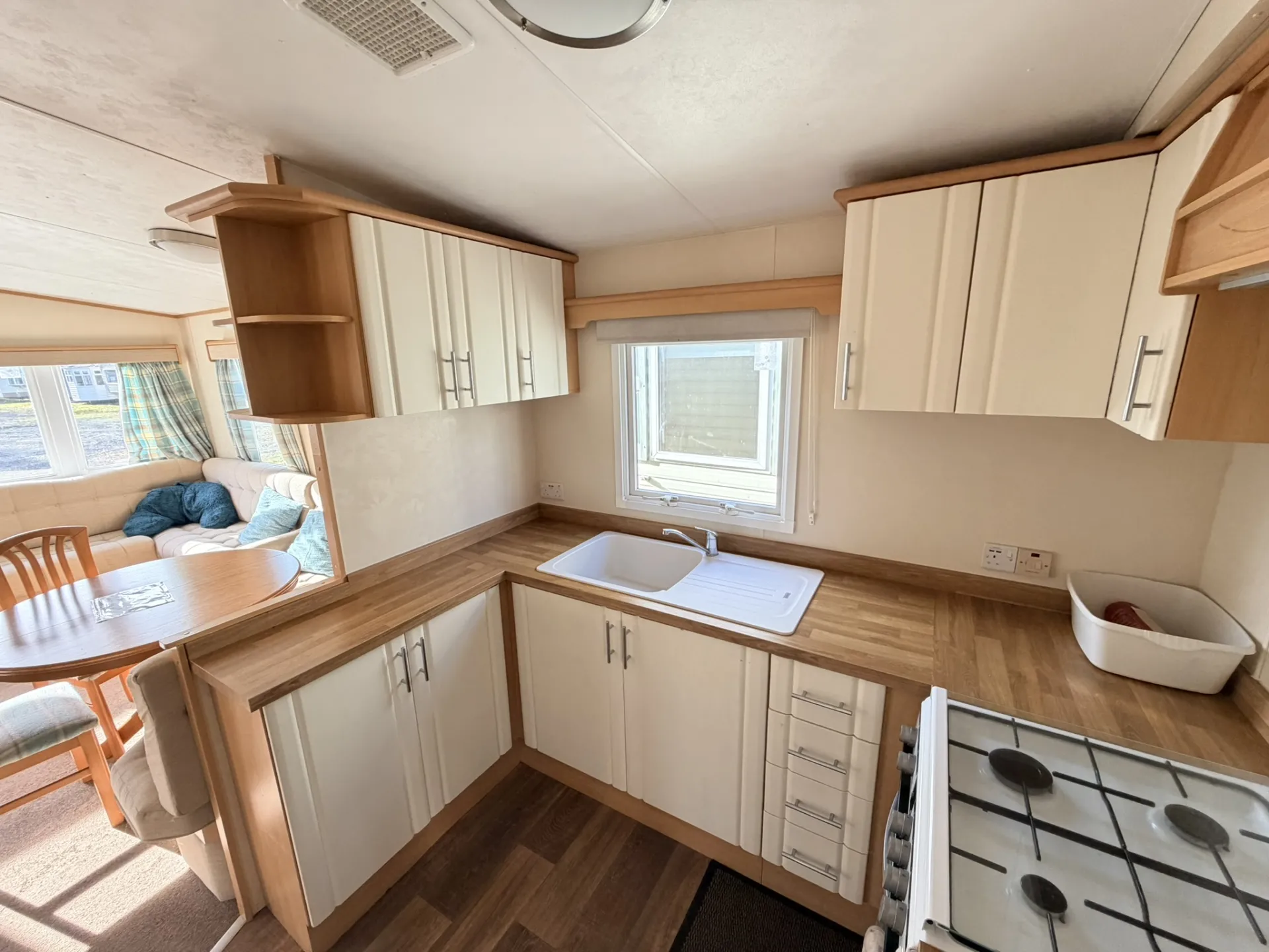 Součástí domu je moderně vybavená kuchyňská linka s dostatkem úložného prostoru, sporákem a lednicí s mrazákem. Obývací část nabízí místo pro jídelní kout i pohodlné posezení.