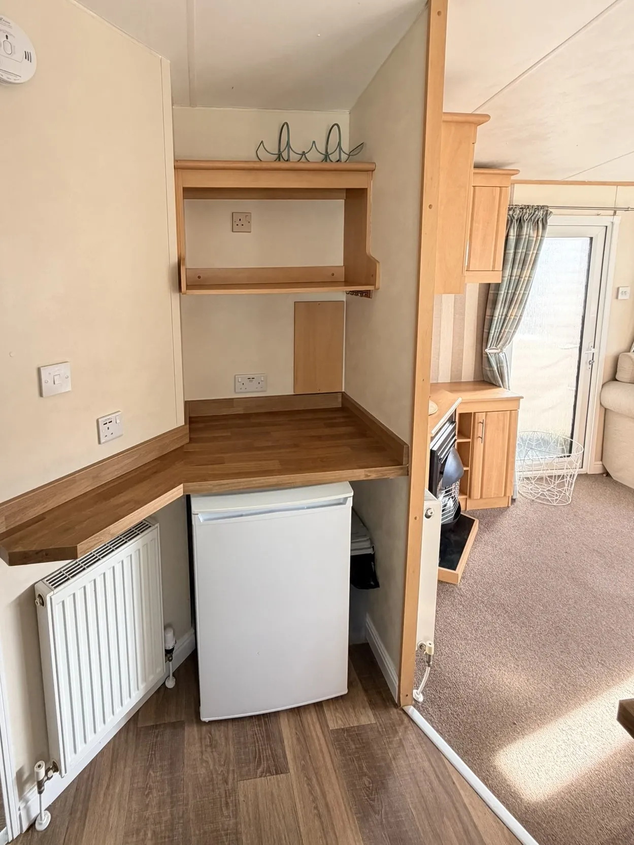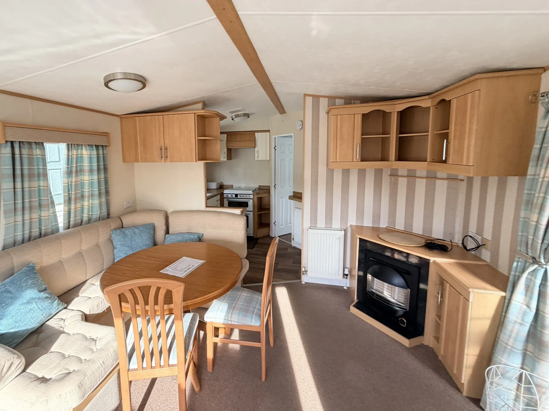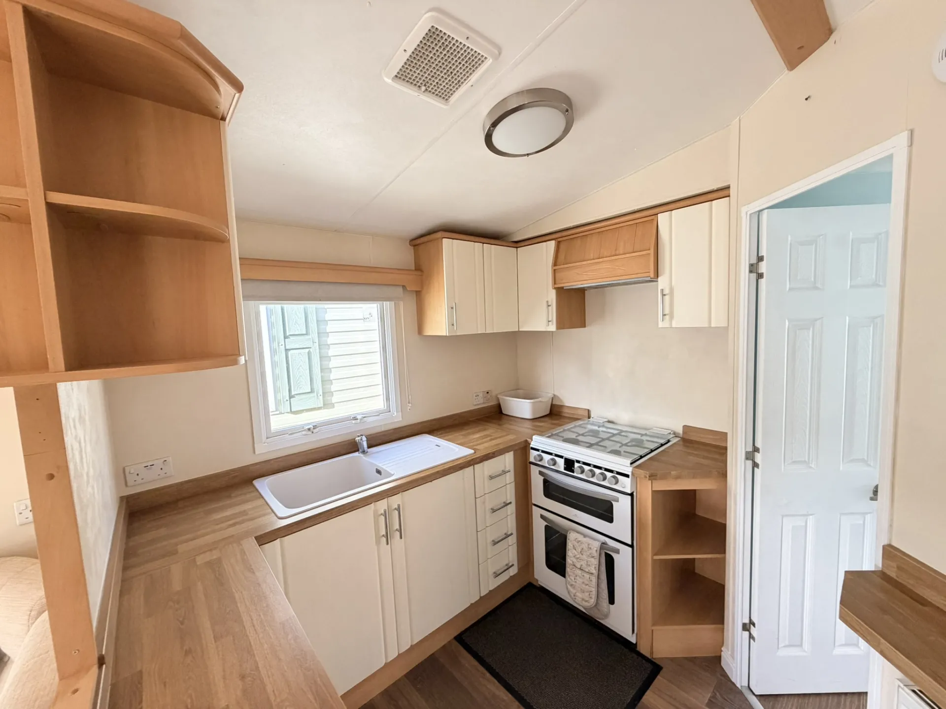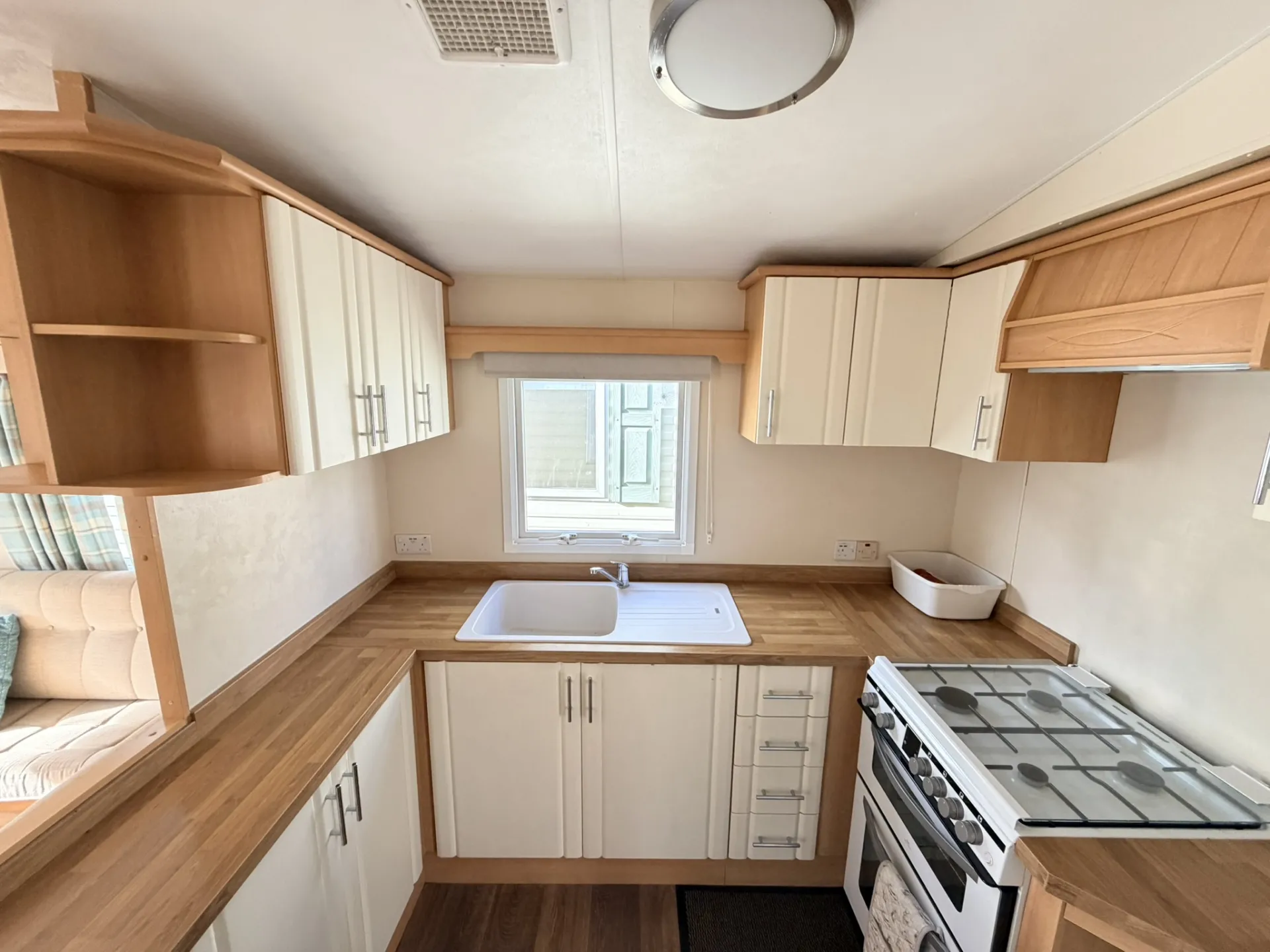 Součástí domu je moderně vybavená kuchyňská linka s dostatkem úložného prostoru, sporákem a lednicí s mrazákem. Obývací část nabízí místo pro jídelní kout i pohodlné posezení.