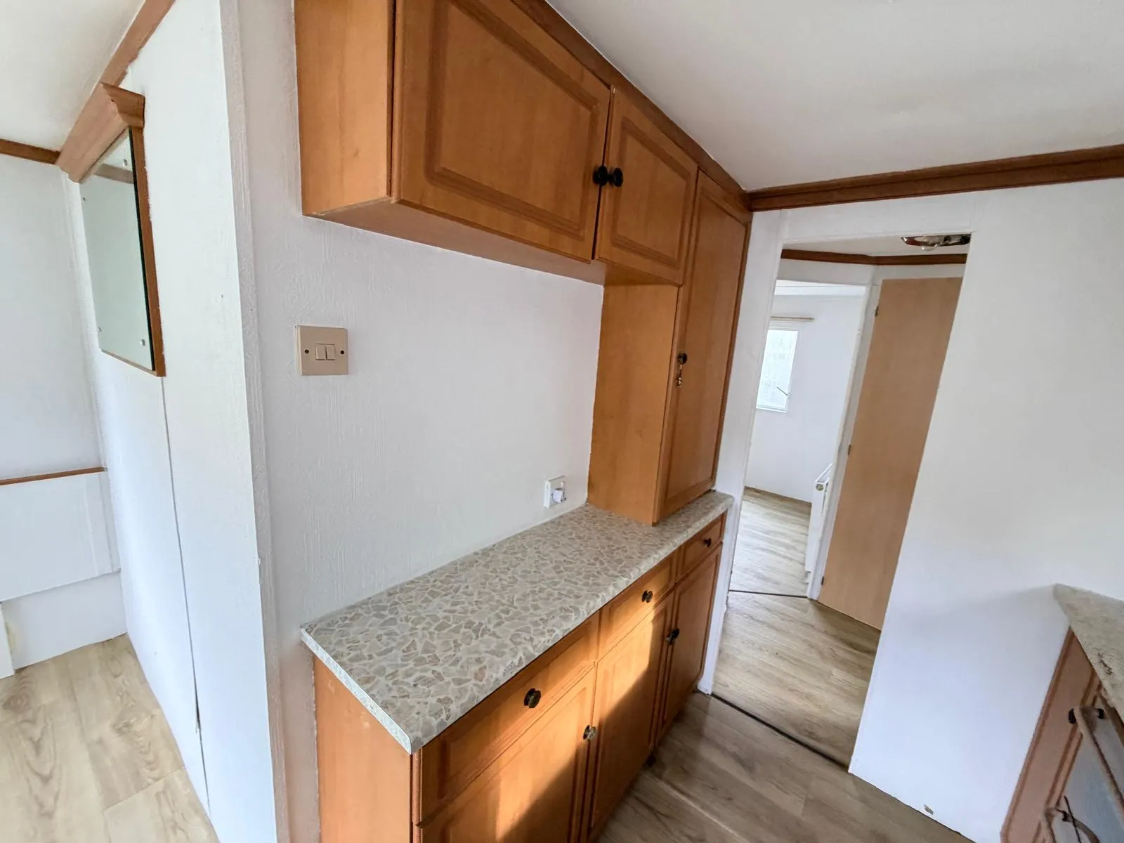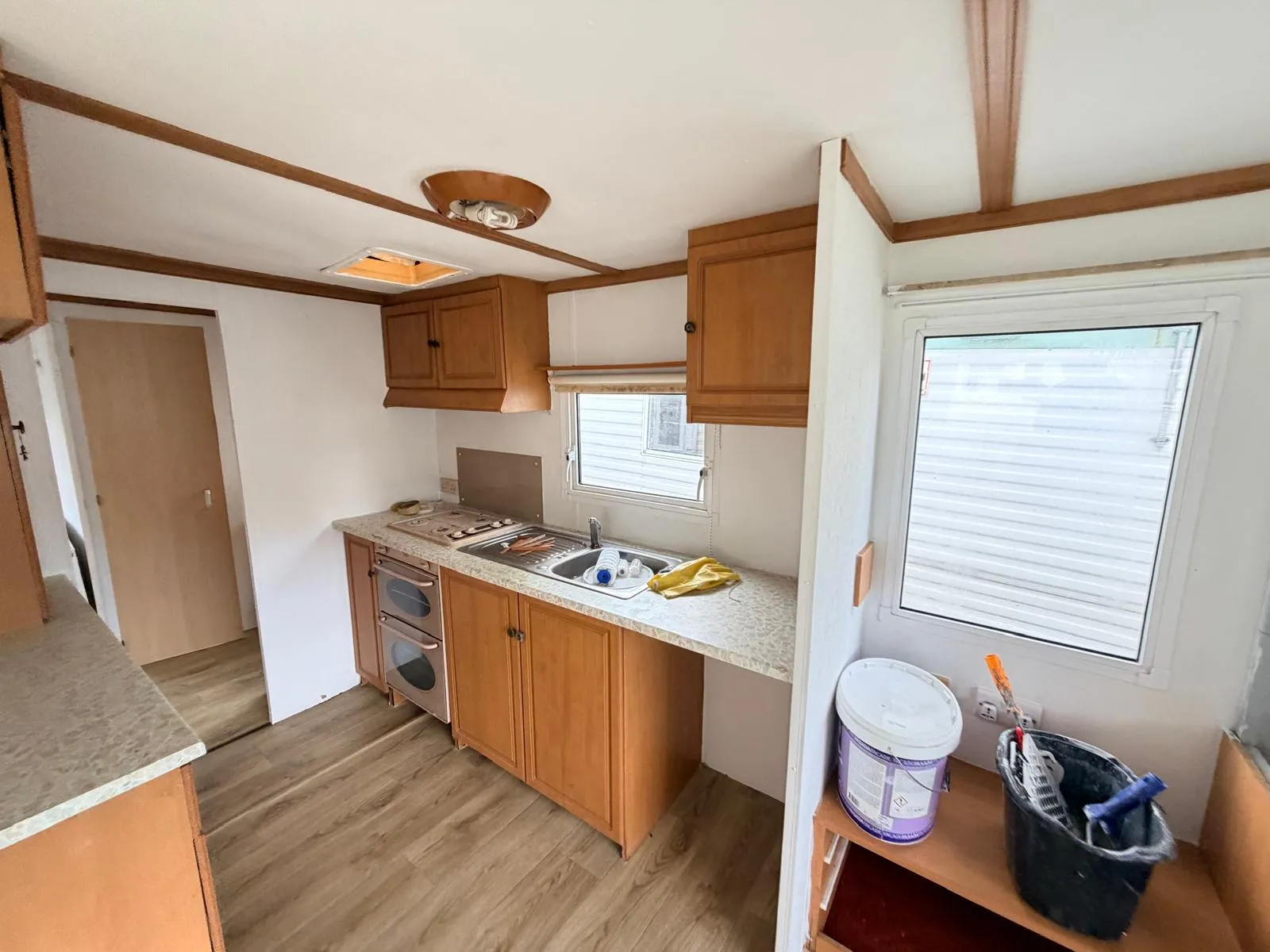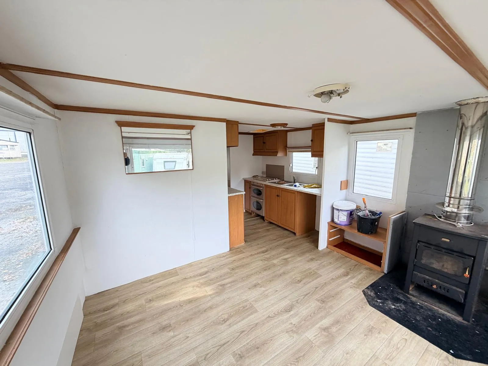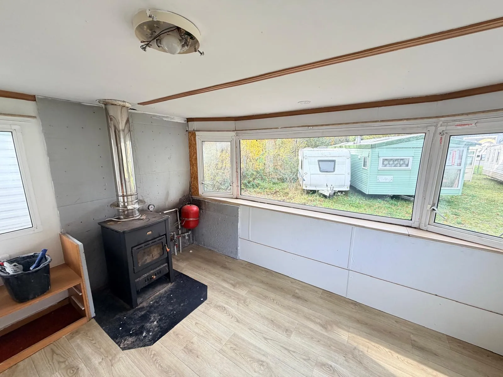 Dispozici doplňují dvě samostatné ložnice a obytná část, ve které je nově položeno linoleum a provedena čerstvá výmalba, takže působí čistým a upraveným dojmem. Koupelnu je nutné dokončit, což z tohoto mobilního domu dělá ideální volbu pro kutila, který si interiér dotvoří podle vlastních představ.