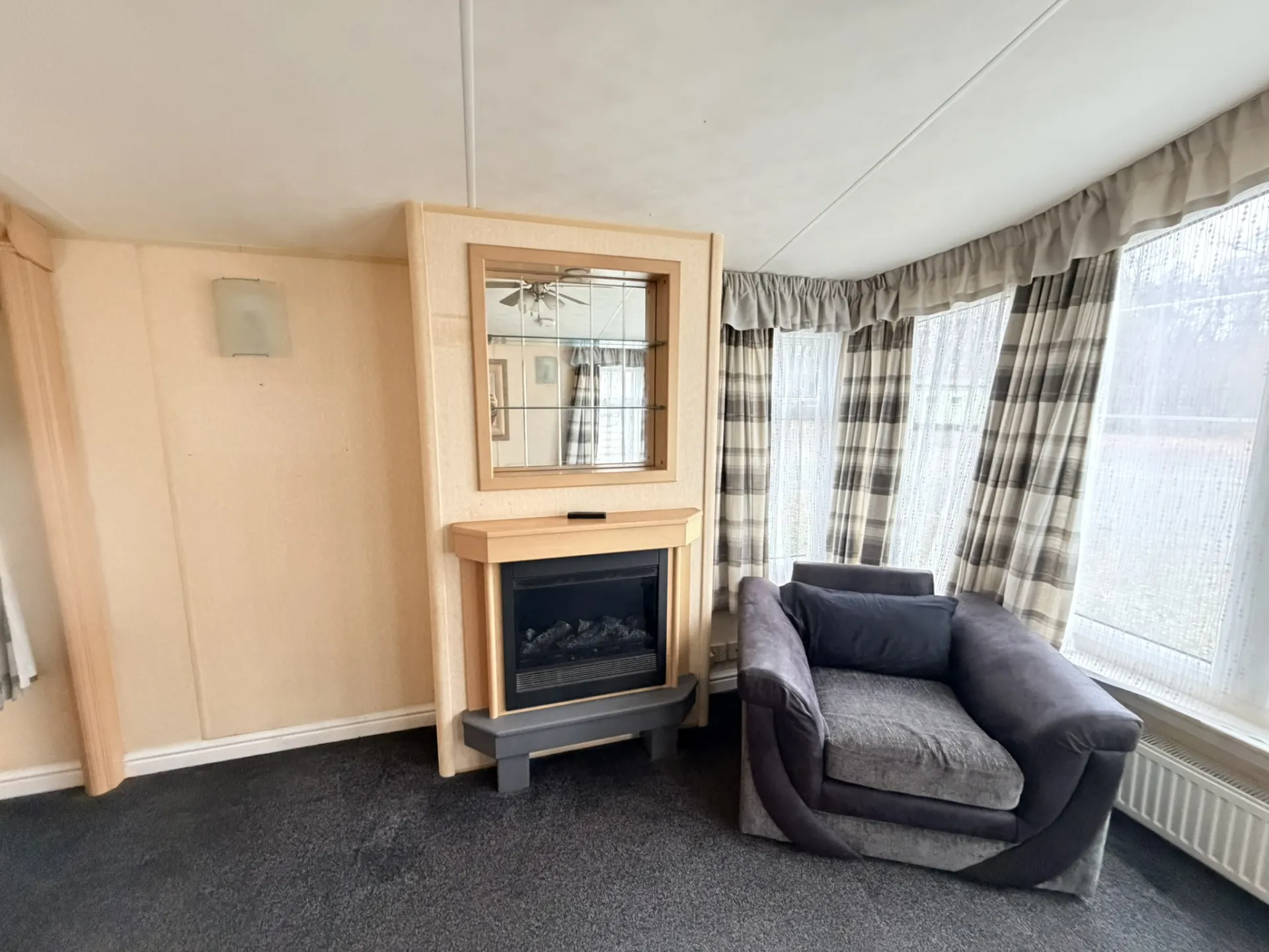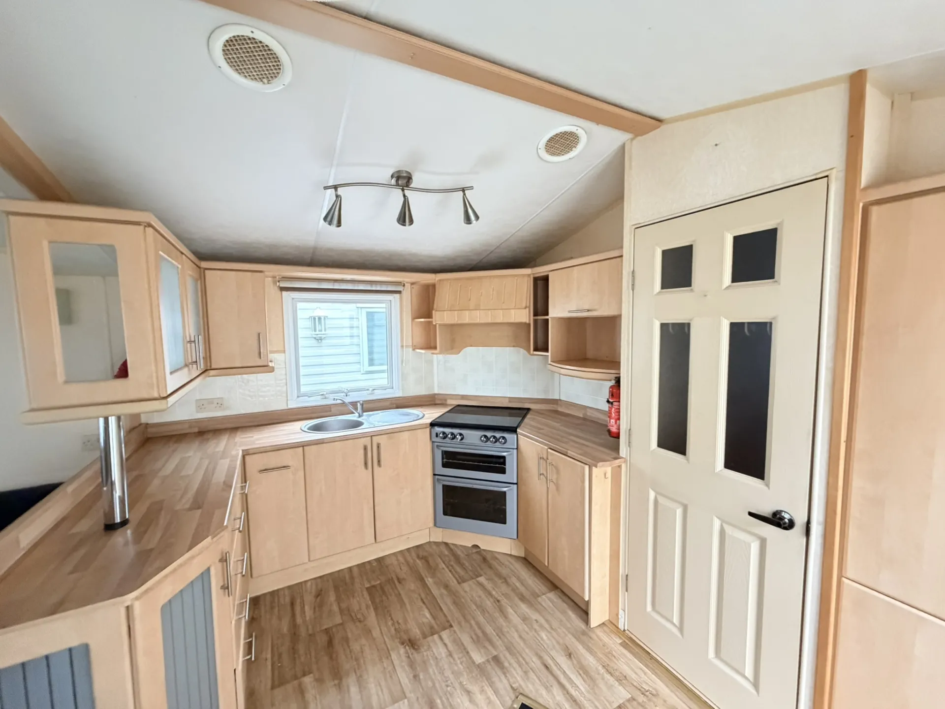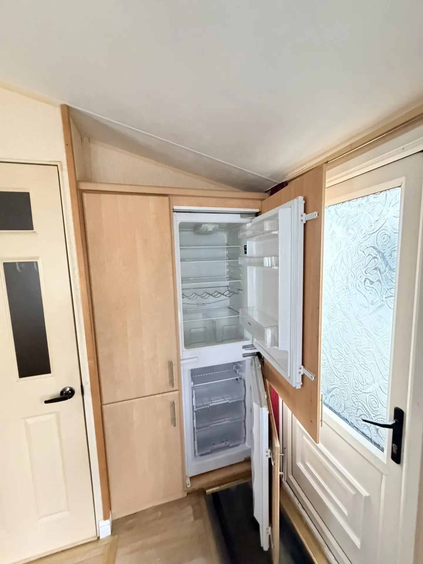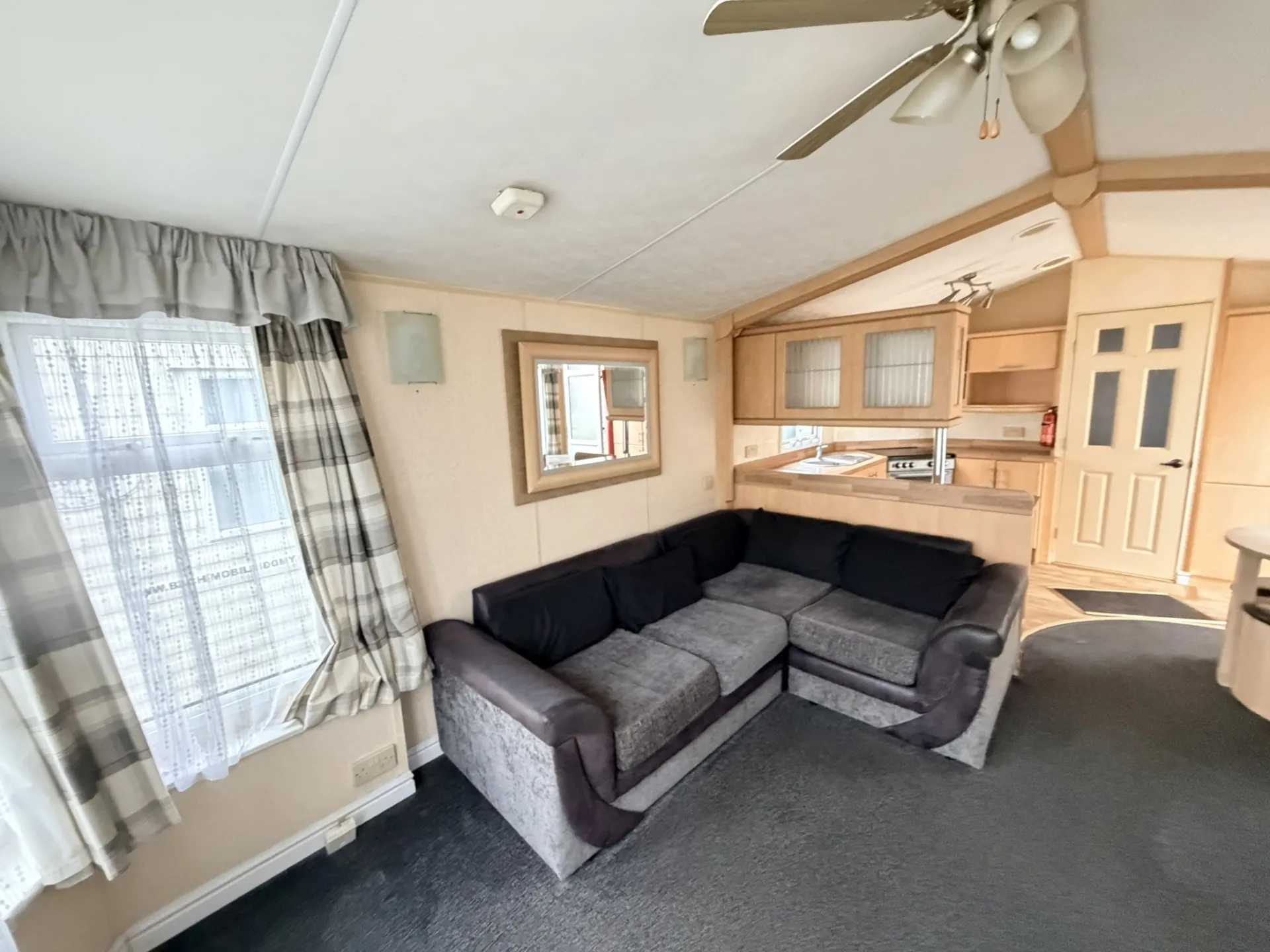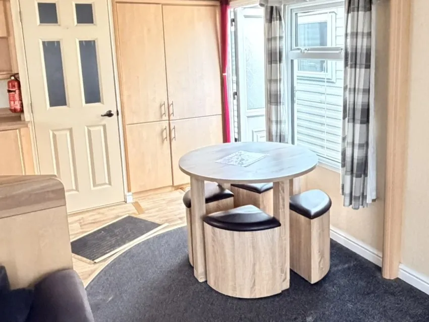 Prostorný a vzdušný celoroční mobilní dům Willerby Aspen 3+kk po prvních majitelích zaujme velkorysým obývacím prostorem, zvýšenými stropy a praktickým uspořádáním. Díky plastovým oknům s izolačními dvojskly a centrálnímu plynovému topení ve všech místnostech nabízí příjemné bydlení s dostatkem komfortu. Hlavní vstup vede do světlého obývacího pokoje, který plynule navazuje na velkou kuchyň ve tvaru „U“ vybavenou spotřebiči – lednicí, mrazákem, plynovou troubou, mikrovlnnou troubou a nerezovým dřezem.
