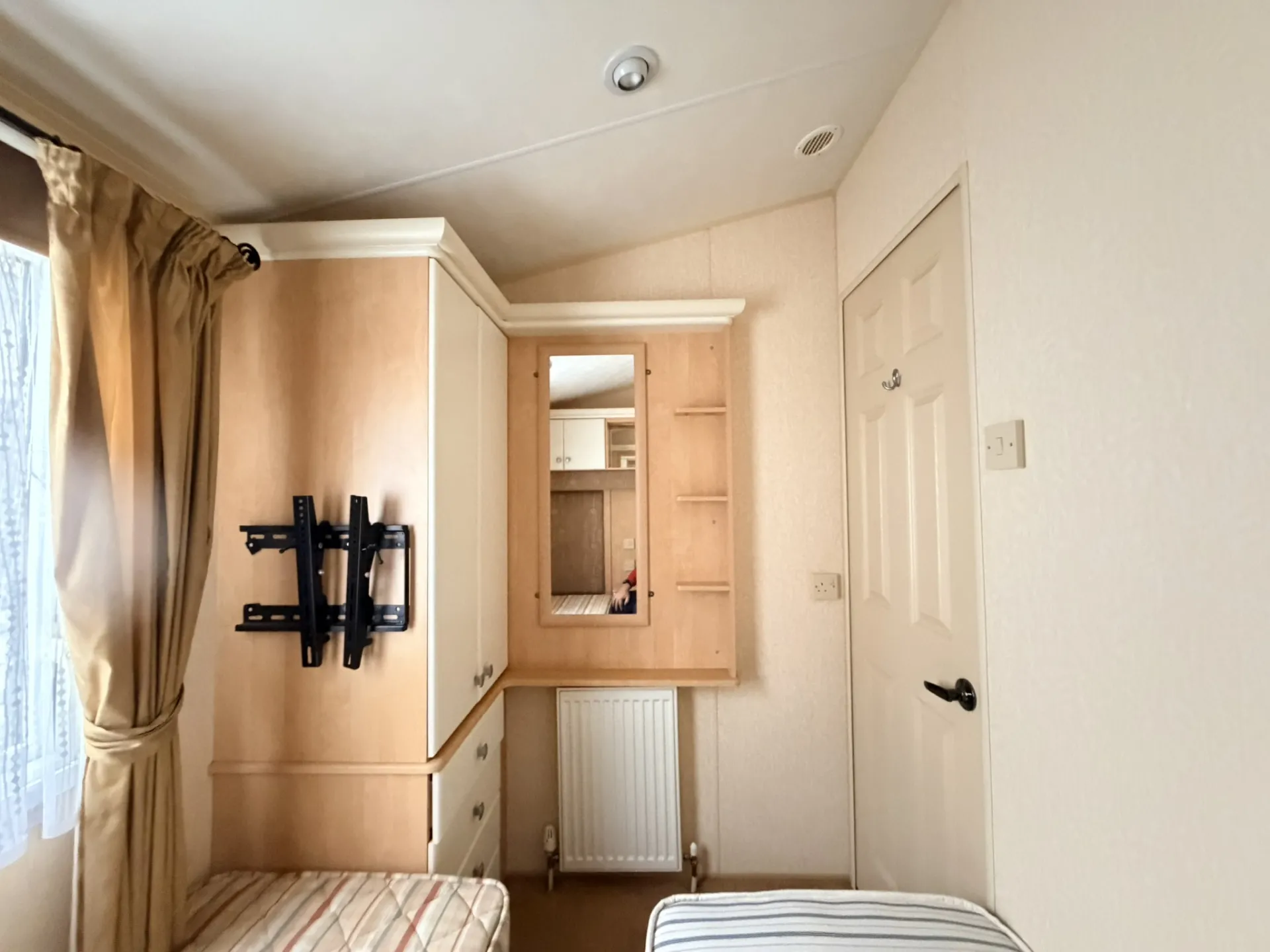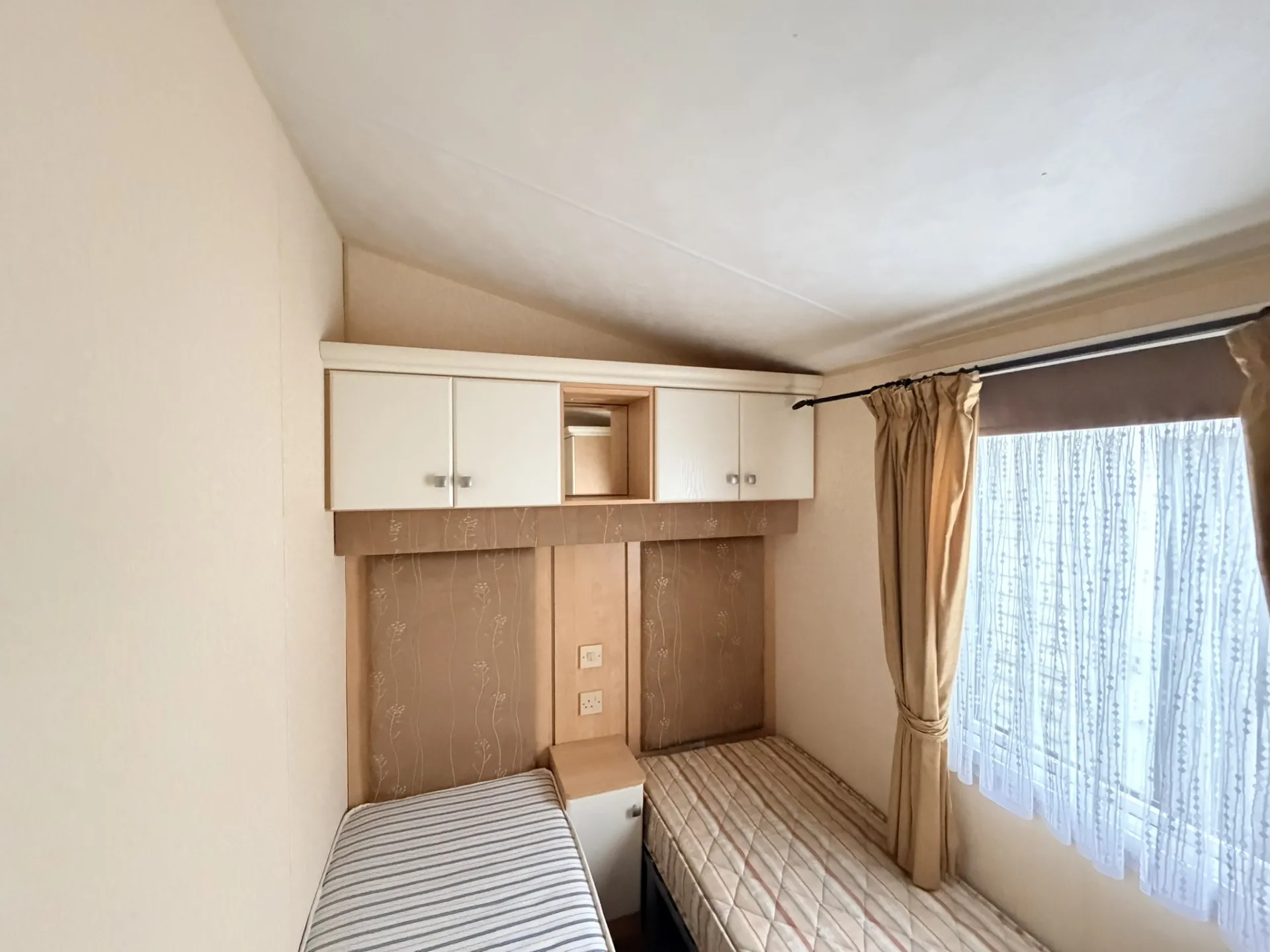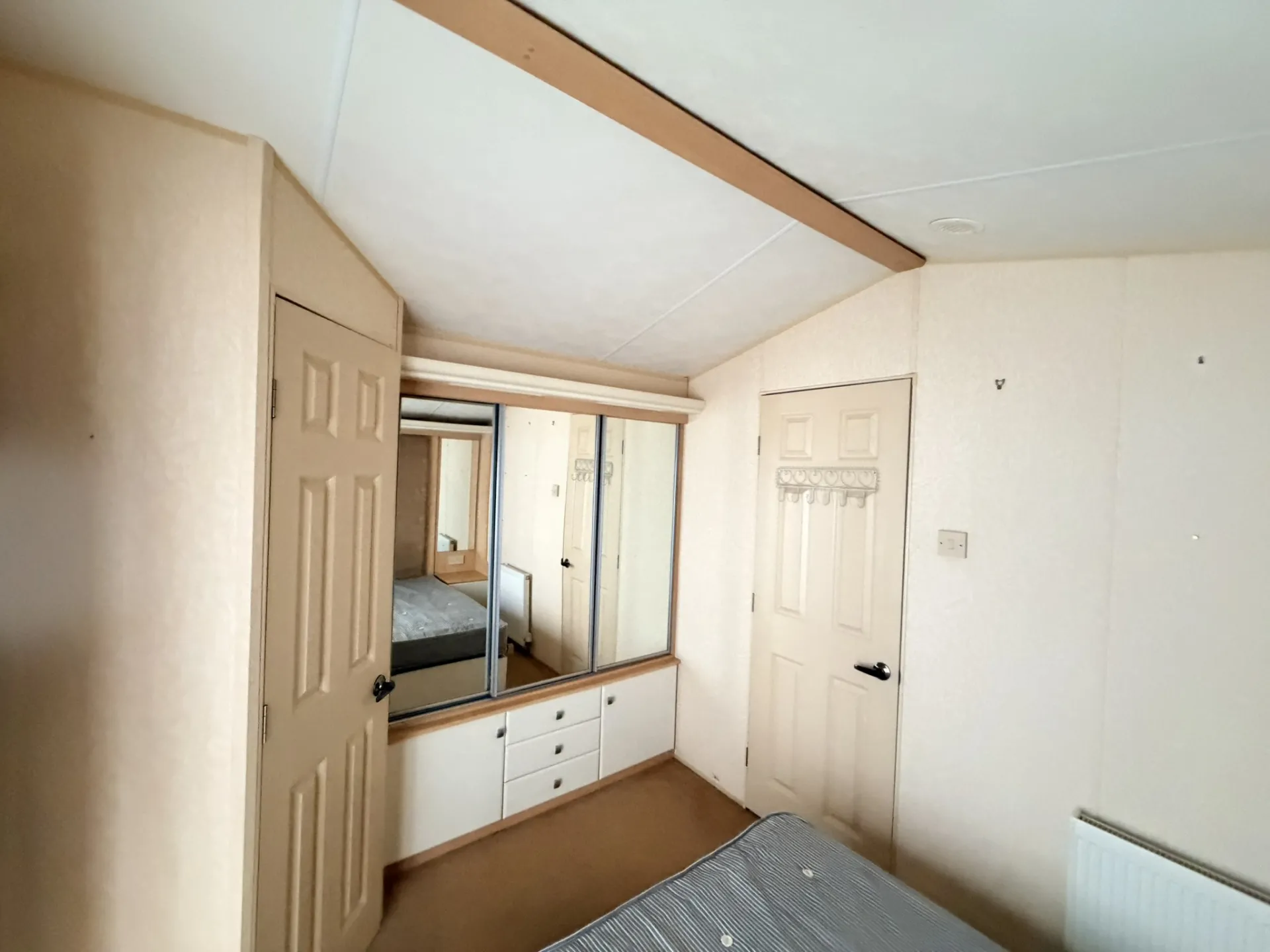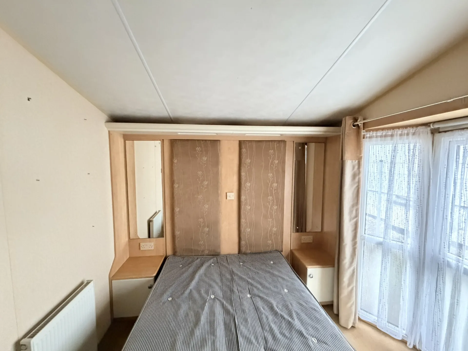 Hlavní ložnice disponuje dvoulůžkem, praktickým úložným prostorem a vlastním samostatným WC. Druhý pokoj je připraven pro dvě spaní a hodí se jako dětský nebo hostinský pokoj. Z chodby je přístupná koupelna se sprchovým koutem a WC. Ohřev vody zajišťuje plynová karma. Zvýšený strop v celém mobilním domě umocňuje pocit prostoru a vzdušnosti.