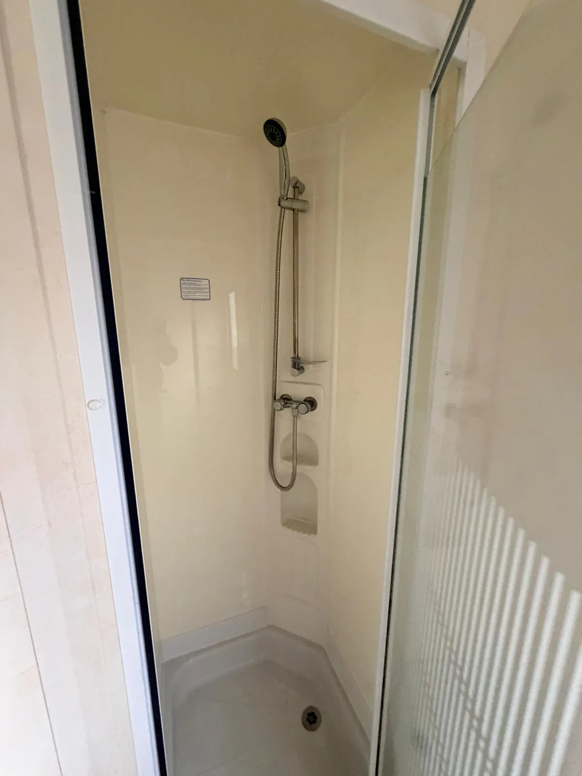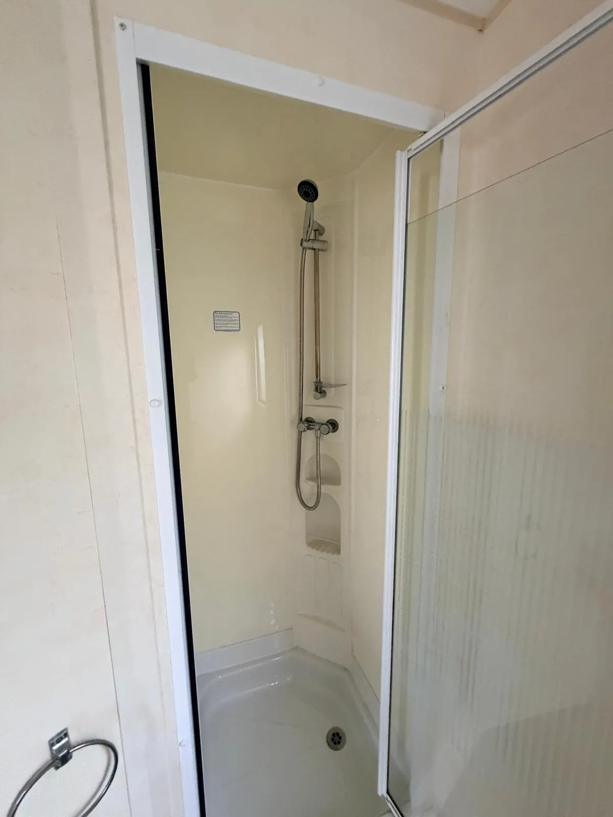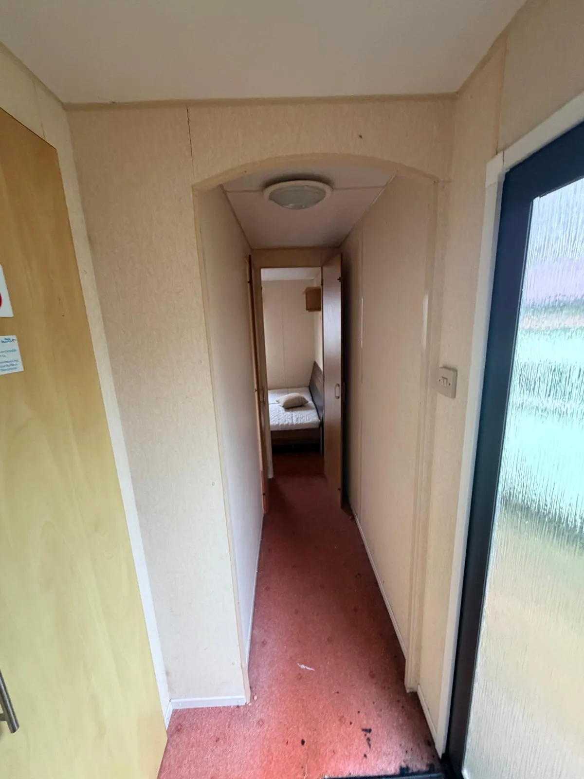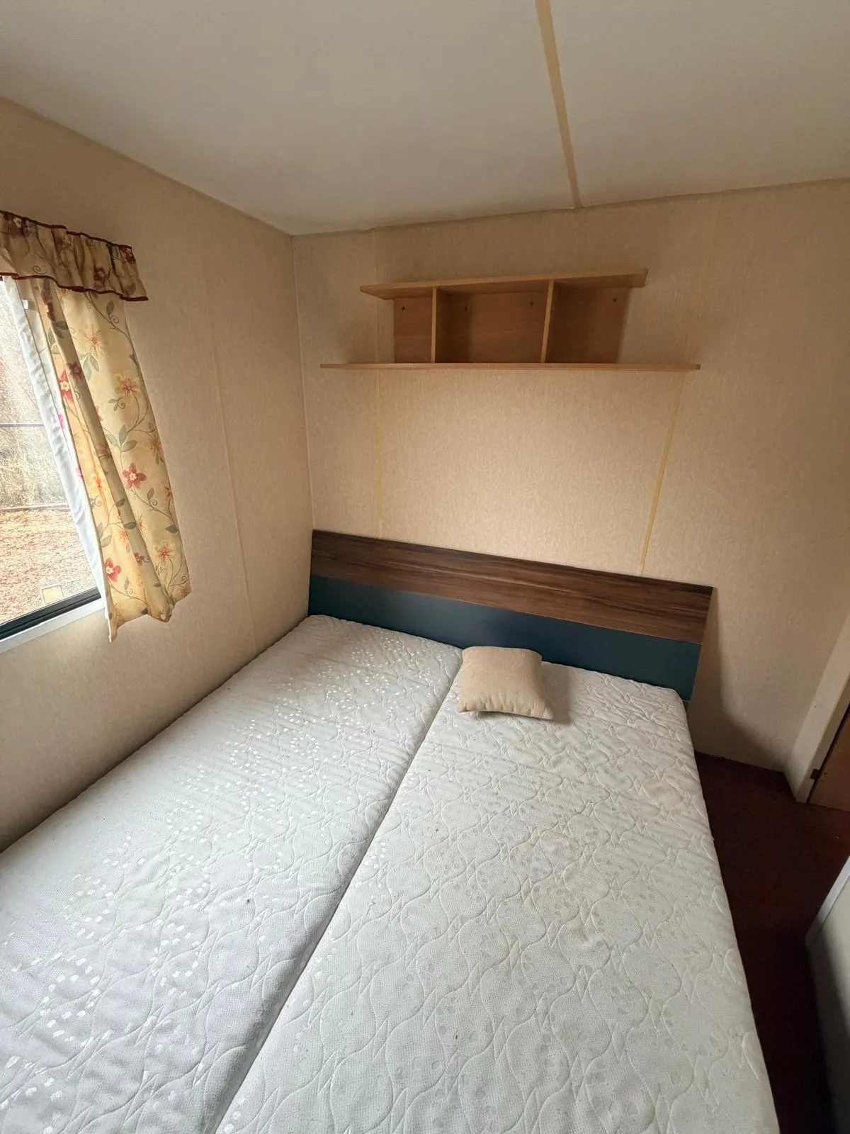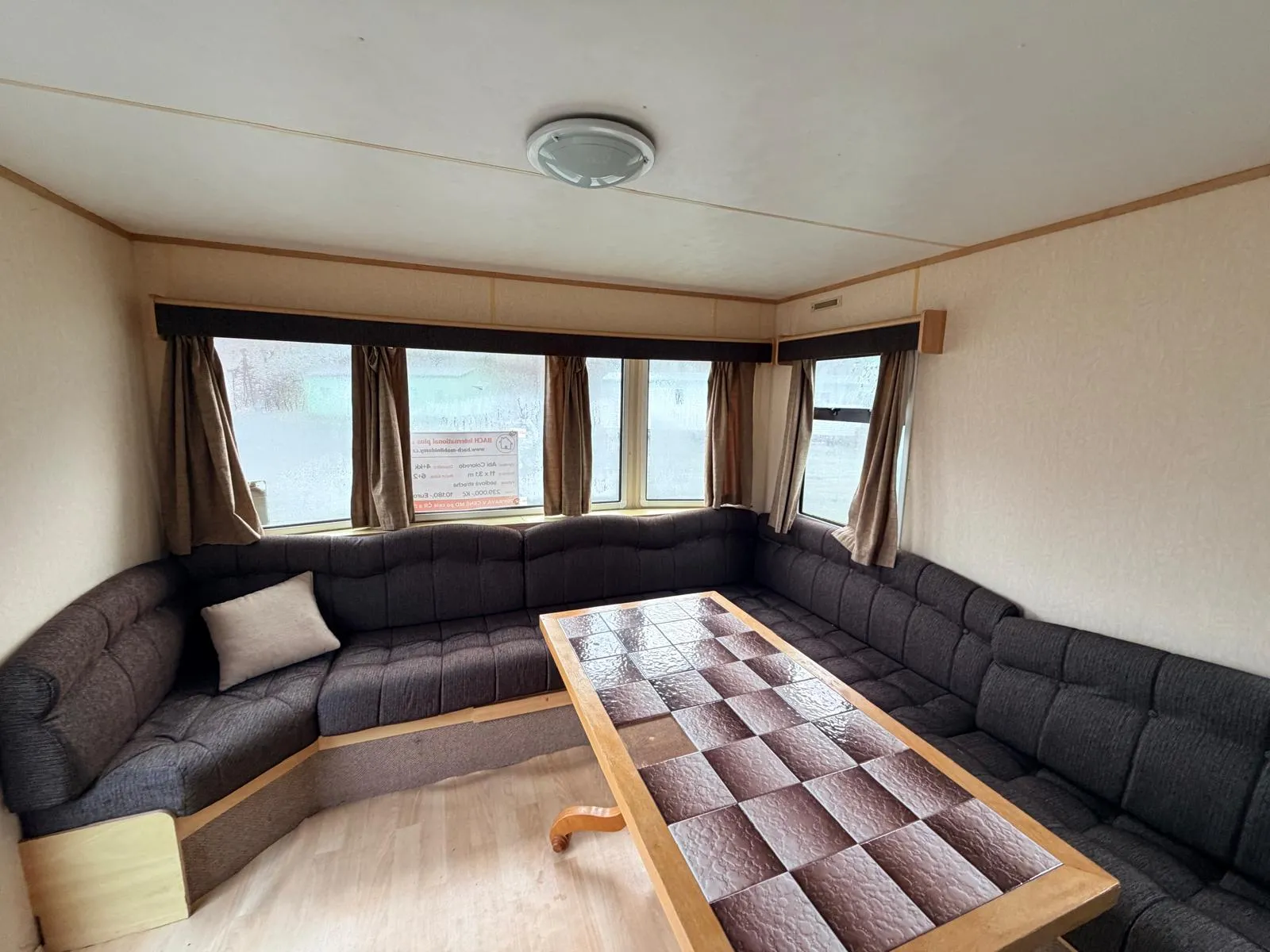 Extra široký, kompletně vybavený. 2 vchody, sedlová střecha, jednoskelná okna. Uvnitř velký obývák + jídelna, kuchyň do „U“, ložnice + 3 pokoje, koupelna se sprchou a WC. Vytápění plynovým krbem + el. přímotopy, ohřev vody karma.