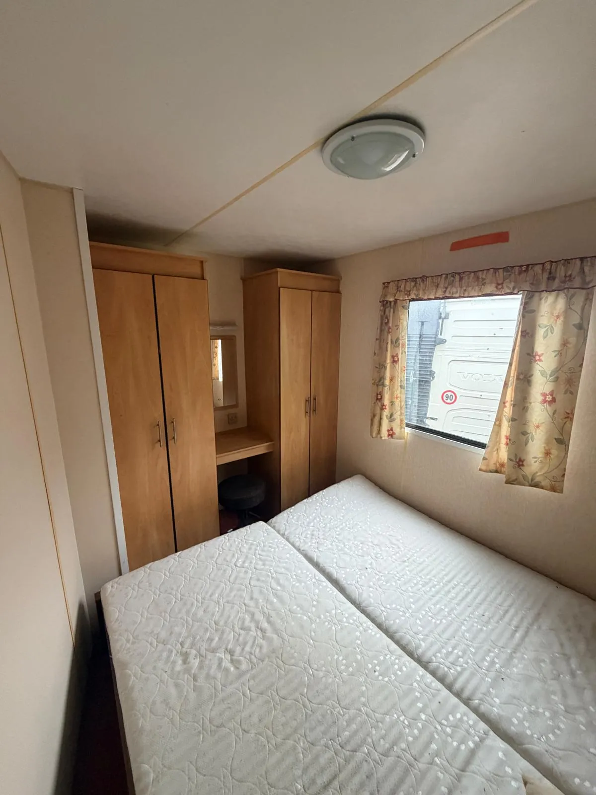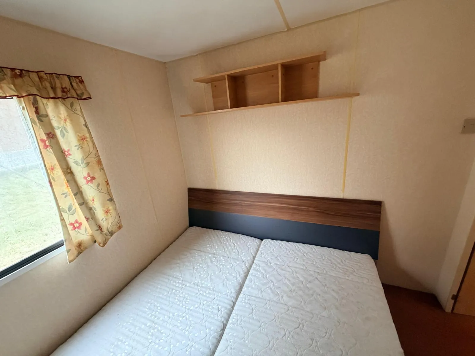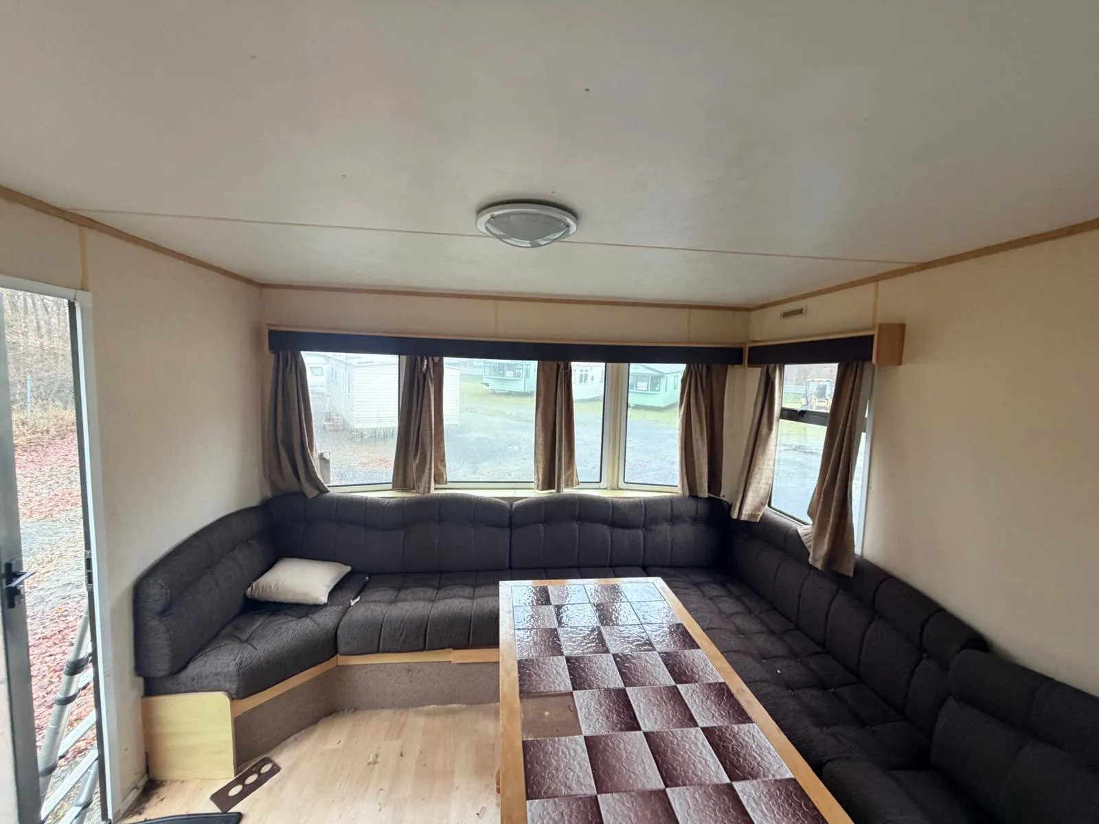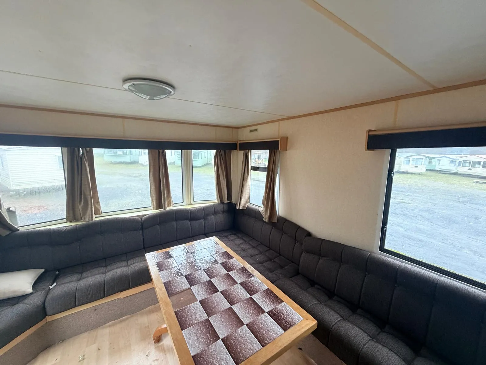 Extra široký, kompletně vybavený. 2 vchody, sedlová střecha, jednoskelná okna. Uvnitř velký obývák + jídelna, kuchyň do „U“, ložnice + 3 pokoje, koupelna se sprchou a WC. Vytápění plynovým krbem + el. přímotopy, ohřev vody karma.