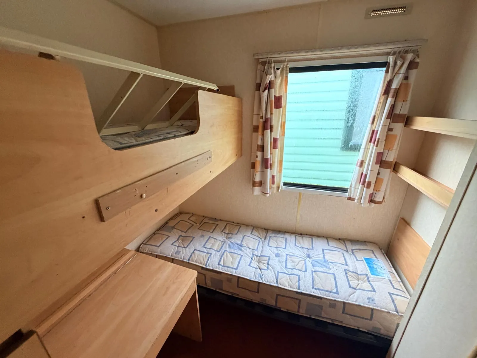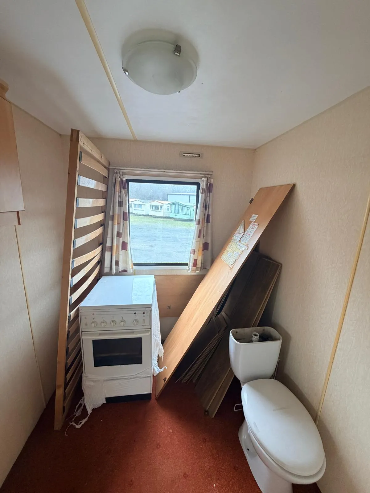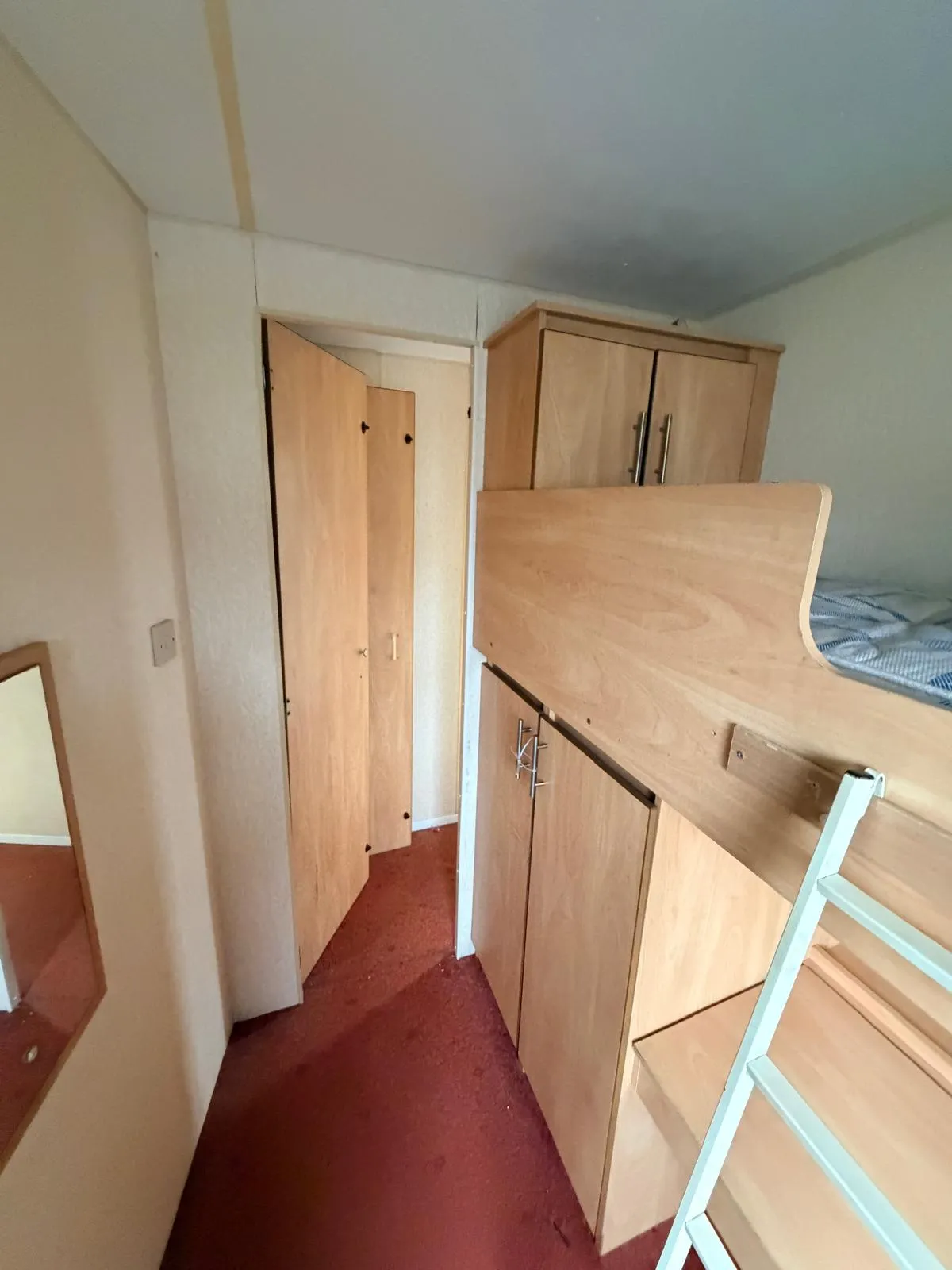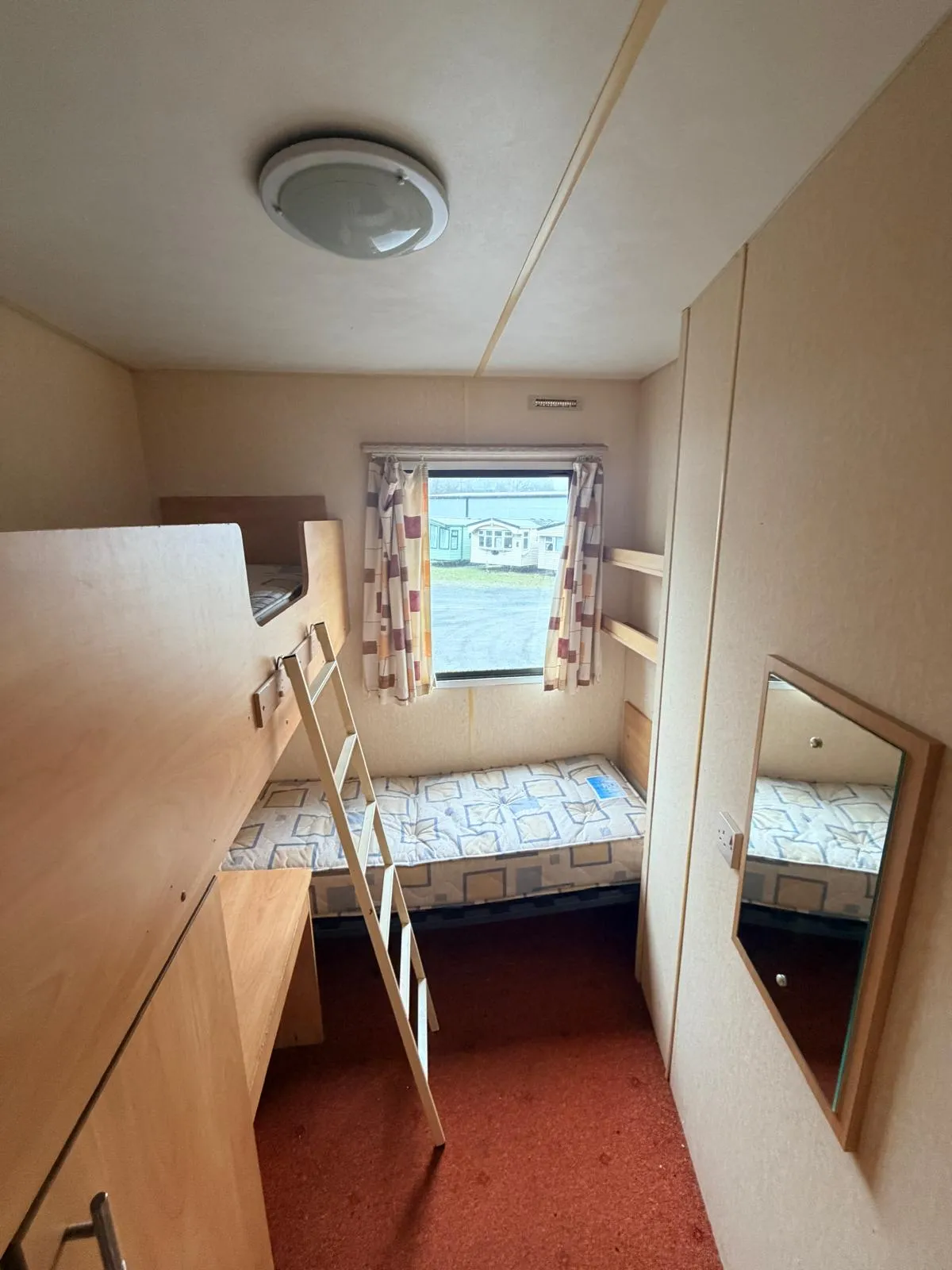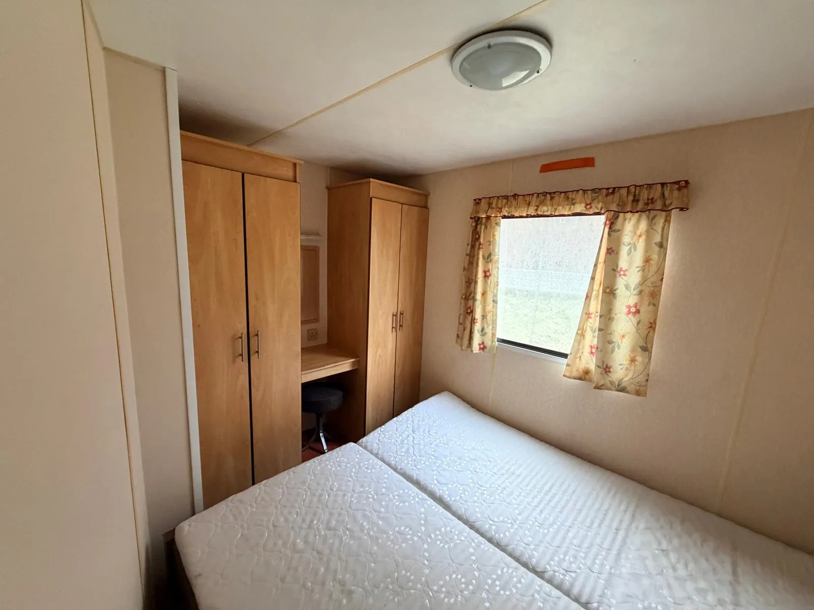 Extra široký, kompletně vybavený. 2 vchody, sedlová střecha, jednoskelná okna. Uvnitř velký obývák + jídelna, kuchyň do „U“, ložnice + 3 pokoje, koupelna se sprchou a WC. Vytápění plynovým krbem + el. přímotopy, ohřev vody karma.