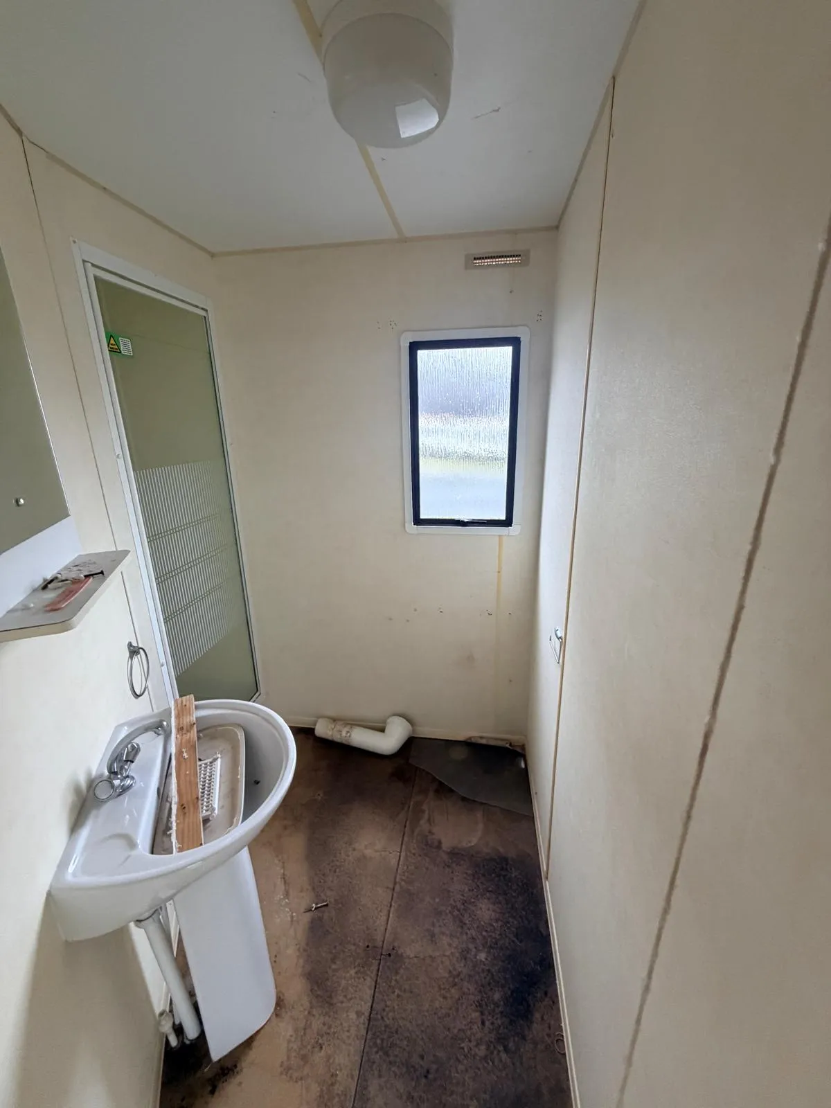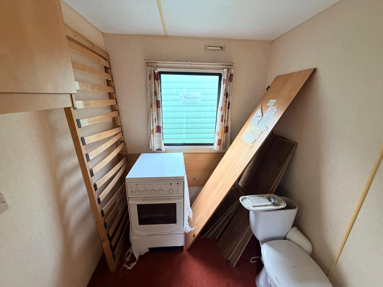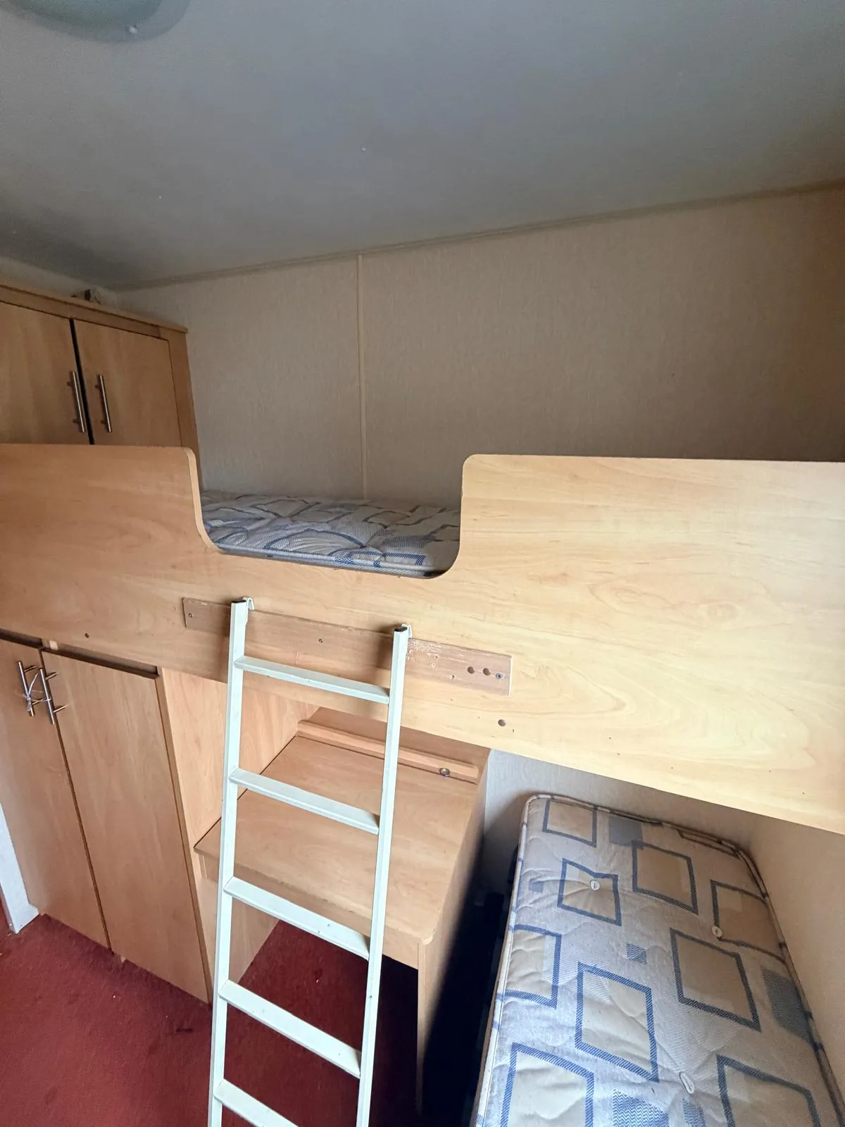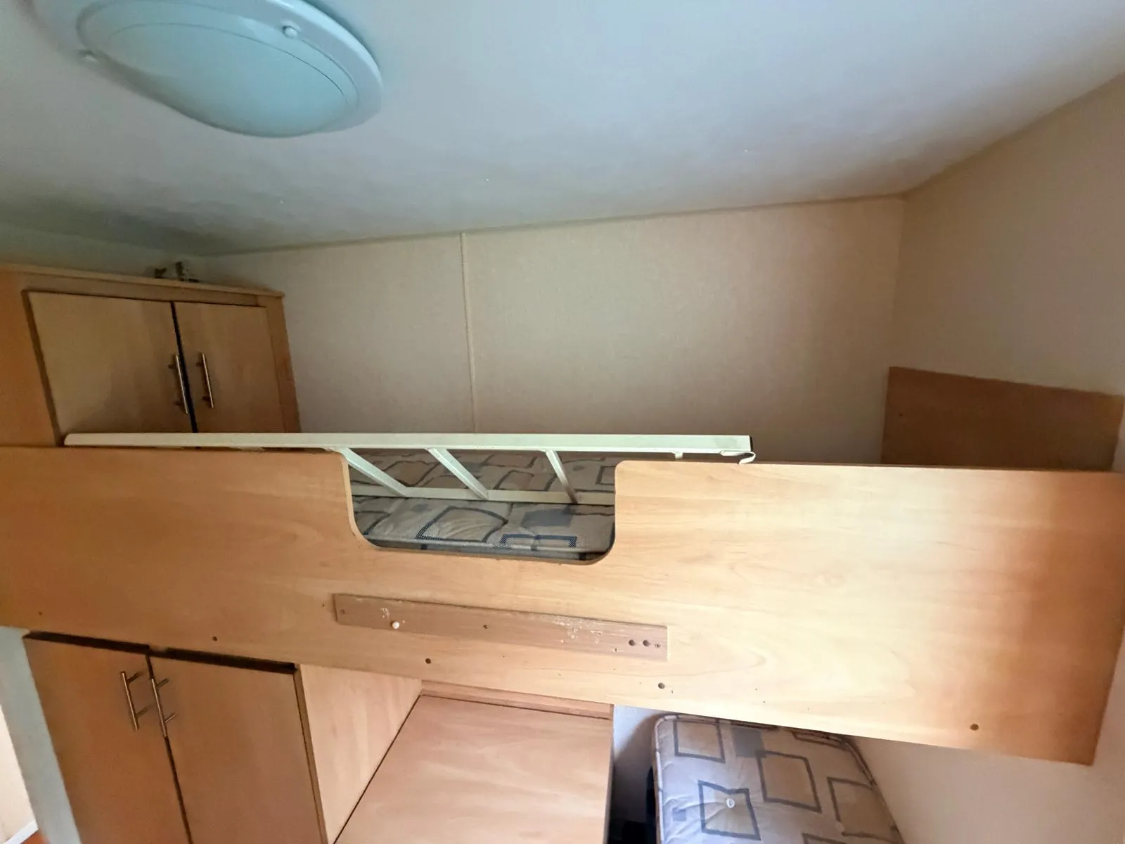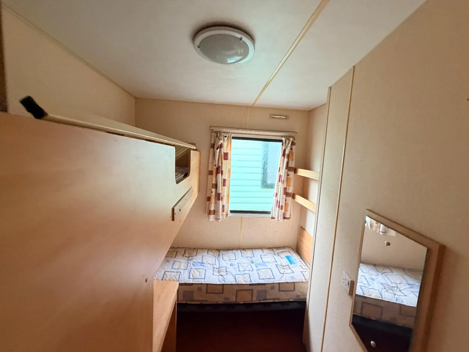 Extra široký, kompletně vybavený. 2 vchody, sedlová střecha, jednoskelná okna. Uvnitř velký obývák + jídelna, kuchyň do „U“, ložnice + 3 pokoje, koupelna se sprchou a WC. Vytápění plynovým krbem + el. přímotopy, ohřev vody karma.