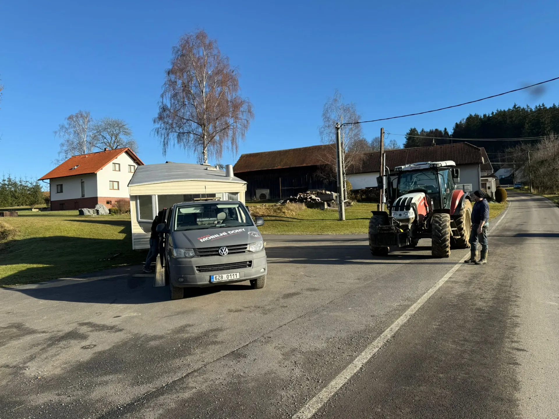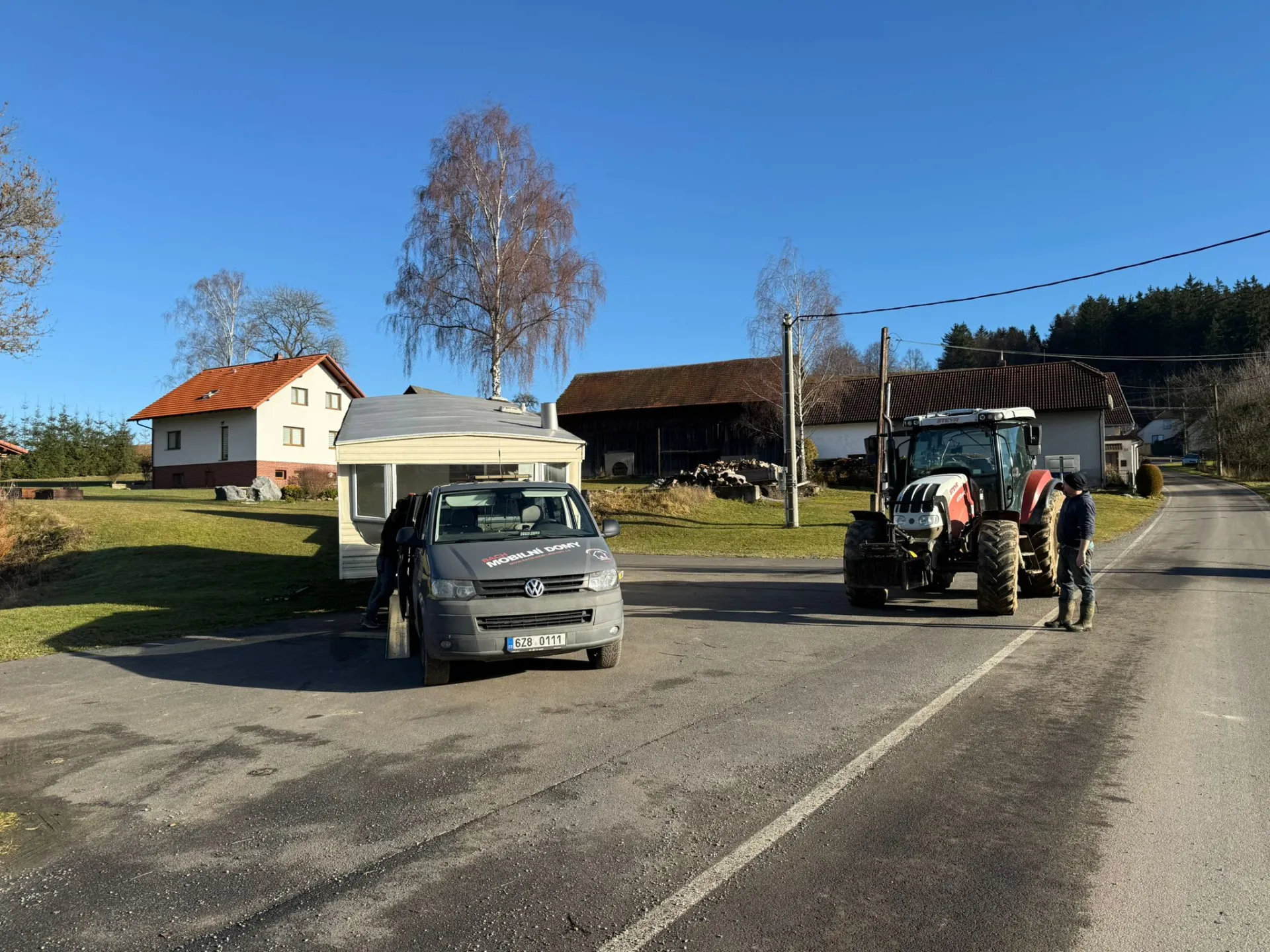 Mobilní dům usazený na místě! Dneska to byla akce na centimetry – těsný přejezd přes mostek, ale díky asistenci traktoru Steyr vše proběhlo v klidu a přesně. Dům stojí na svém místě. Obrovské díky celému týmu Bach International Plus za perfektní práci!