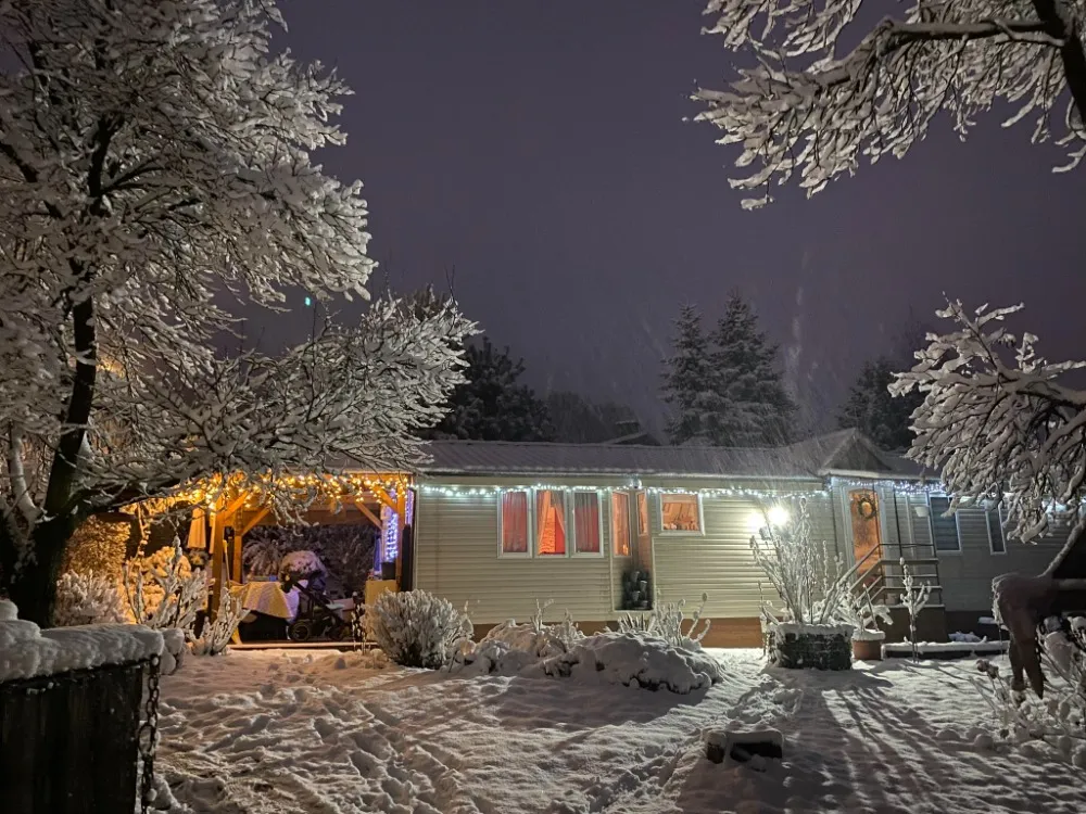 Foto od zákazníka, který si obložil mobilheim dřevem. Mobilní dům je v krásném prostředí a vypadá, jako kdyby tam byl odjakživa.
